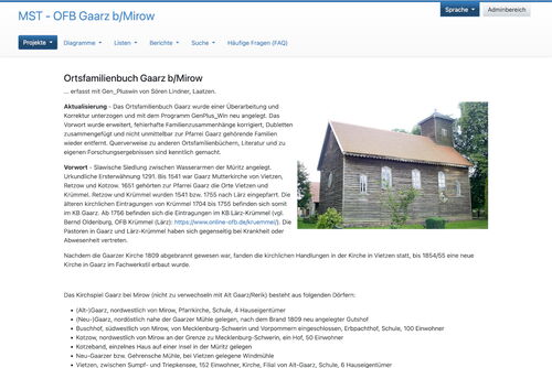 Das Ortsfamilienbuch Gaarz b/Mirow wurde von Sören Lindner einer Überarbeitung und Korrektur unterzogen und mit dem Programm Gen_Pluswin neu angelegt. Die erfassten Daten enthalten 5898 Personen und 2027 Familien.