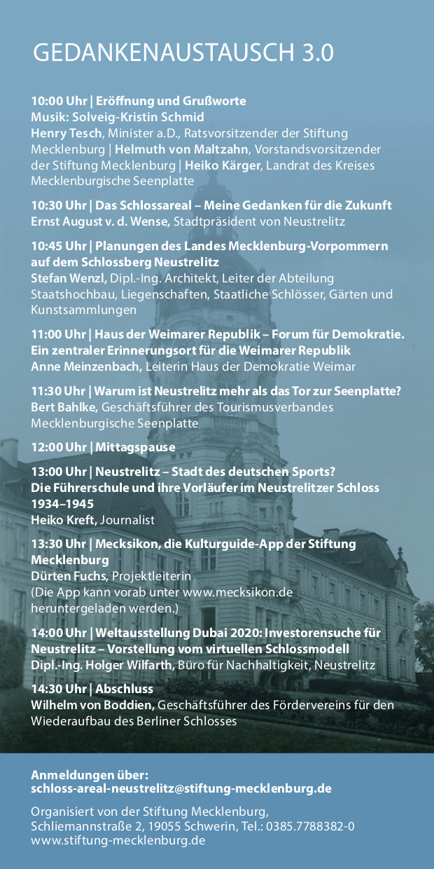 In Zusammenarbeit mit der Stadtvertretung Neustrelitz möchte die Stiftung Mecklenburg an diesem Tag dem zivilgesellschaftlichen Austausch über die Zukunft des Schlossareals Neustrelitz wieder ein Forum bieten. Nähere Informationen zum Programmablauf entnehmen Sie bitte dem anliegenden Flyer.