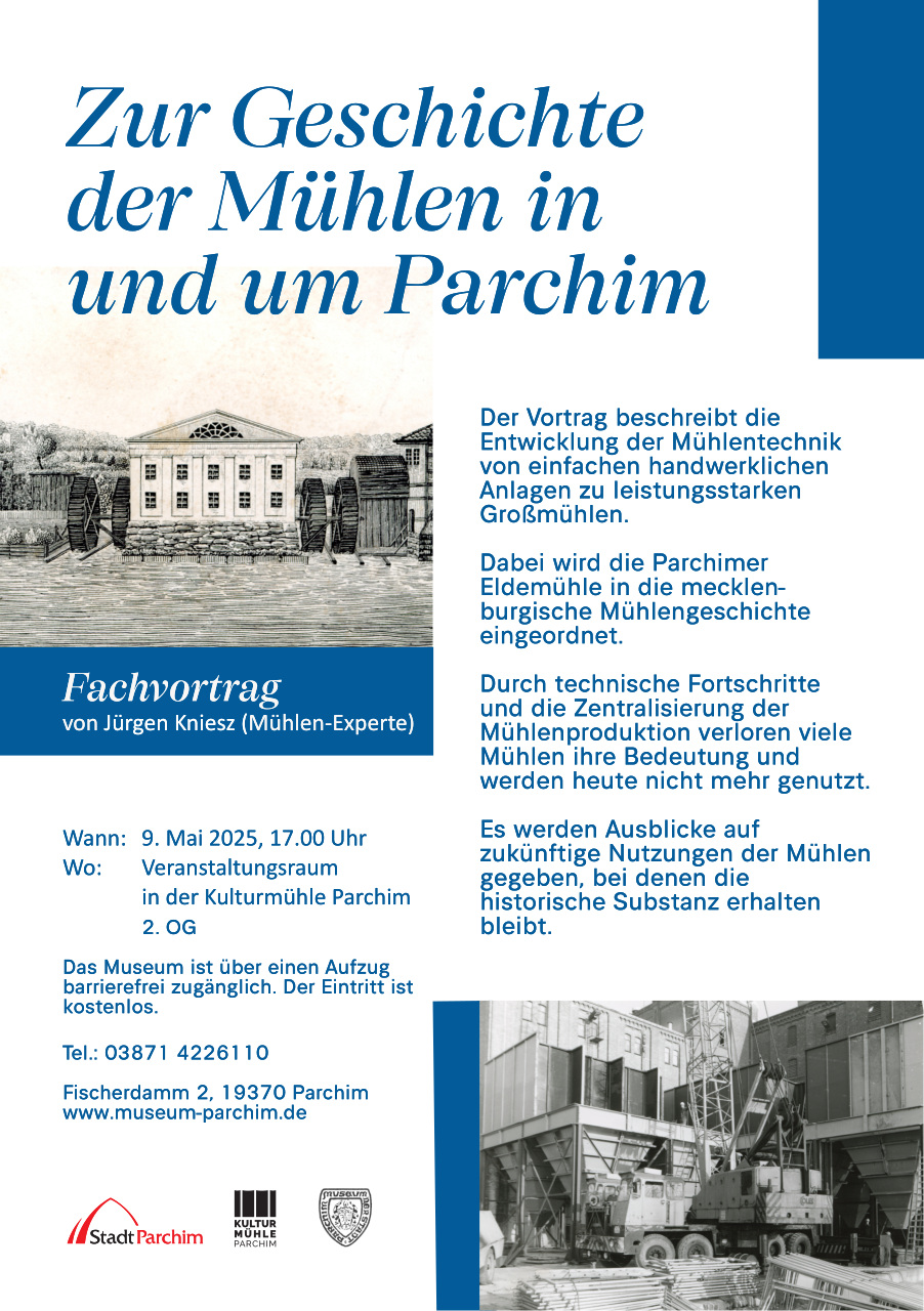Der Fachvortrag von Jürgen Kniesz (Mühlen-Experte) beschreibt die Entwicklung der Mühlentechnik von einfachen handwerklichen Anlagen zu leistungsstarken Großmühlen. Dabei wird die Parchimer Eldemühle in die mecklenburgische Mühlengeschichte eingeordnet.