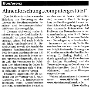 Besonders interessant für die Anfänger war der Vortrag von B. Knust (Garbsen), der u. a. handwerkliche Techniken eines Ahnenforschers vorstellte. Bauernfamilien bei Rehna wurden von W. Jacobs (Wittenförden) untersucht. Durch die Kopplung der Familiengeschichte mit der Geschichte Mecklenburgs ergab sich eine spannende Präsentation. Auf Probleme des Datenschutzes in der Ahnenforschung wies K.-H. Steinbruch (Schwerin) in seinem Bericht vom Genealogentag in Potsdam hin.
