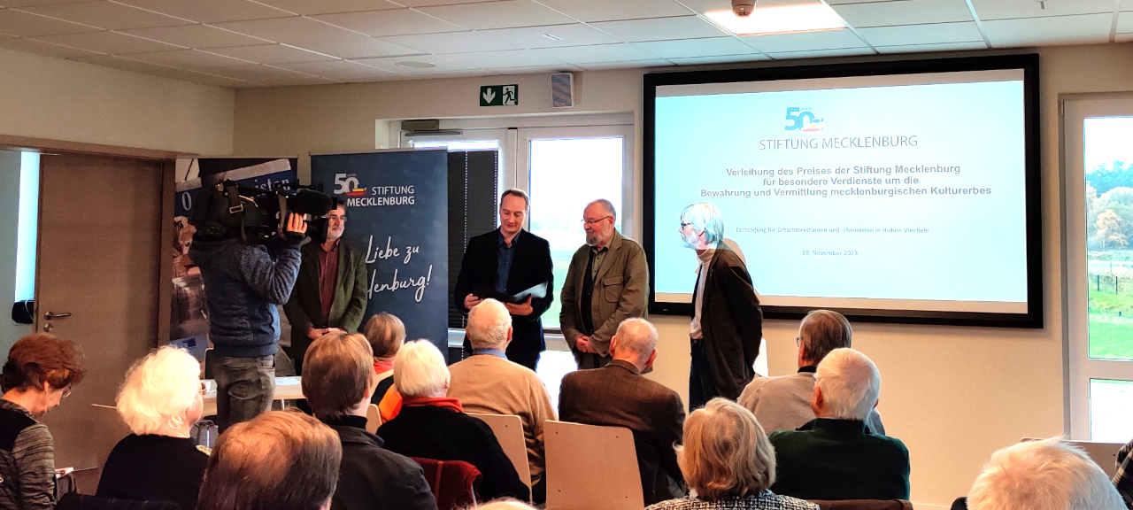 Den Abschluss des Vormittags bildete die Verleihung des Preises der Stiftung Mecklenburg für besondere Verdienste um die Bewahrung und Vermittlung mecklenburgischen Kulturerbes durch Herrn Dr. Florian Ostrop. Mit einer Laudatio von Dr. Wolf Karge wurde der mit 1000€ dotierte Preis dem sichtbar bewegten ehemaligen Leiter des Landeshauptarchives in Schwerin, Dr. Andreas Röpcke überreicht. Danach ging es mit vielen Gesprächen in die Mittagspause. Viele nutzten auch das Angebot, die Kirche in Hohen Viecheln zu besichtigen.