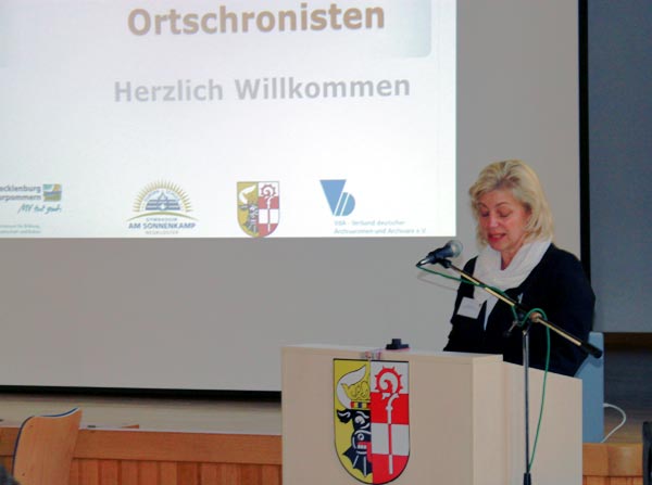 Am 19. November trafen sich die Ortschronisten des Landkreises Nordwestmecklenburg zu ihrer 21. Fachtagung in Neukloster. In der Aula des Gymnasiums waren rund 50 Chronisten, Hobby-Historiker und Interessierte zusammen gekommen (Foto oben), um den Vorträgen der Referenten zu lauschen. Eröffnet wurde die Fachtagung durch die Landrätin Frau Kerstin Weiss (Foto unten), die Tagungsleitung hatte wie immer Dr. Reno Stutz inne. Auch dieses Jahr war der MFP durch einige Mitglieder vertreten. Neben weiteren Referenten war dieses Jahr aber auch unser Schriftführer Dirk Schäfer (Foto unten) als Referent eingeladen. Er sprach zum Thema „Der genealogische Verein und seine Arbeit für die Orts- und Regionalgeschichte“. Neben der Vorstellung unseres Vereins bekräftigte er in seinem Vortrag auch den Wunsch einer stärkeren Zusammenarbeit mit den Ortschronisten bzw. regionalen Heimat- und Geschichtsvereinen. In den Pausen und nach der Veranstaltung fand sich zudem wieder Zeit für interessante Gespräche mit „alten Bekannten“ und interessierten Tagungsteilnehmern.