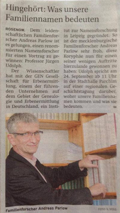 Am 17. September kündigt der Nordkurier den Vortrag des berühmten Namensforscher Prof Udolph an. Zusammen mit einem gelungenen Foto unseres 1. Vorsitzenden Andreas Parlow.