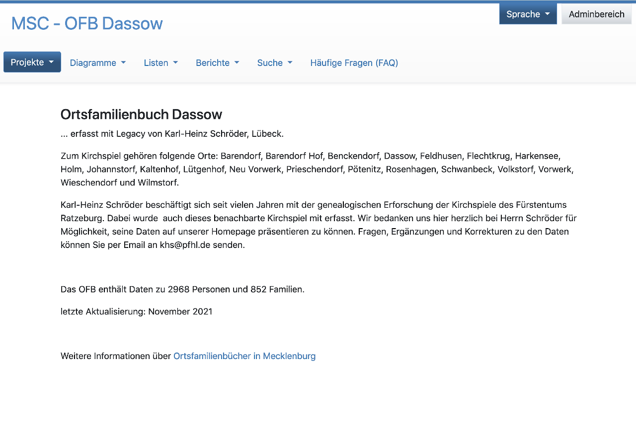 Von Karl-Heinz Schröder aus Lübeck erhielten wir ein Update für das OFB Dassow, welches jetzt 7849 Personen und 2783 Familien umfasst.